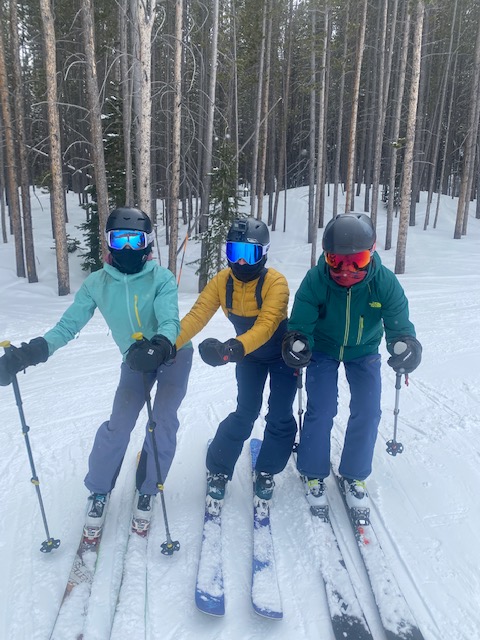 Sue (Broomfield, AM), Ken (Broomfield, AM), Meredith (Denver, AM), Emmy (Fairfield, AM) … Tamar (NYC, PM), Lizzy (Colorado Springs, PM), Evan (Boulder, PM). So, a bit of different focus from AM to PM but the common threads runs through every lesson: balance in the moguls, turn on top of mogul and come into the top SLOW – use a check turn is needed, pole balance on top of hands, poles behind back to bring upper body forward, hands on knees develops the feel of being lower, put the butt in chair up the hill – also called hip rotation facing outside of turn, pivot turns, initiate turn with new inside ski, leg steering, adduction leg rotation, abduction leg rotation, less edge and more skidding, use more of bottom of ski and not so edgy, CM crossover to initiate edge change, pole plant/touch – bungy this to the hips bringing them forward and lateral, load up the front part of ski at initiation, don’t have lazy arms, pole swing comes from the wrist, ‘two tree’ exercise for feeling the core below the feet (upside down). OK, that’s probably enough to think about.
